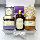 Give the gift of a full spa moment at home. This beautifully wrapped set includes everything needed to exfoliate, cleanse, and deeply relax — all in our calming Lavender & Vanilla scent.